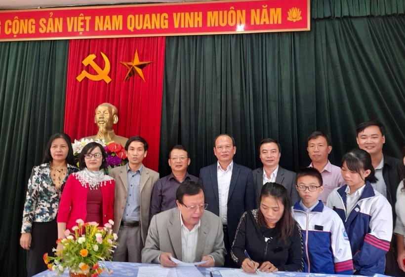 Đoàn công tác cũng tới Phòng GD&ĐT TP Hà Tĩnh, thăm hỏi, động viên cán bộ, giáo viên, học sinh và trao tặng 200 bộ SGK lớp 1 Cánh Diều và 2.000 cuốn vở cho HS vùng rốn lũ khắc phục khó khăn trong học tập.