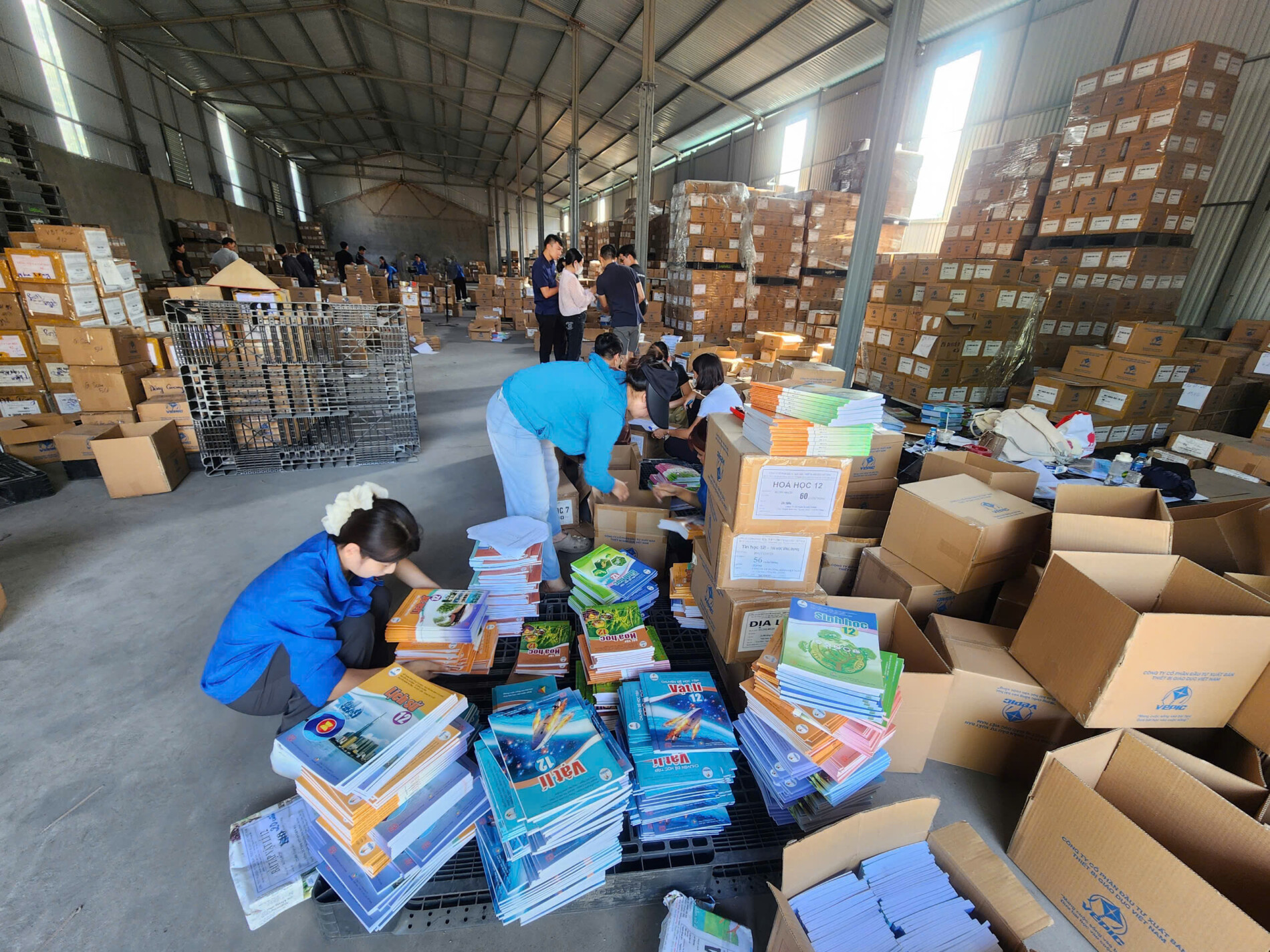 Trong tháng 10/2025, khi thông tin về hoạt động cứu trợ được phát động, Đoàn Thanh niên VEPIC cùng Đoàn Thanh niên Khoa Sinh – Đại học Sư phạm Hà Nội đã cùng xuống kho sách phân loại theo số lượng, yêu cầu, đóng thùng chuẩn bị cho những chuyến xe cứu trợ. Trong mùi giấy mới, mùi keo dán và tiếng băng dán sột soạt, những chiếc áo xanh tuổi trẻ hối hả chia từng bộ sách, dán nhãn, đóng thùng. Giữa cái nóng và mồ hôi, ai cũng nở nụ cười: “Đâu cần thanh niên có, đâu khó có thanh niên.” Chỉ sau một ngày, hàng trăm thùng sách đã được xếp gọn, sẵn sàng lên xe đến với các em nhỏ vùng lũ. Họ gọi vui đó là “ca làm đêm của những người vận chuyển tri thức”. Hình ảnh ấy không chỉ cho thấy tinh thần xung kích của tuổi trẻ, mà còn là sự đồng lòng giữa doanh nghiệp và thế hệ sinh viên – cùng góp sức vì một mục tiêu chung: để tri thức không bị bão cuốn đi.